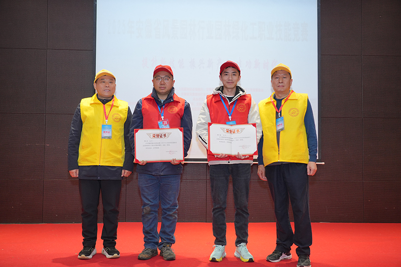 在比赛现场,各位选手热情高涨,精神饱满,以良好的素质和娴熟的技能投入到赛事当中。经过一天的紧张比赛和激烈角逐,最终来自合肥滨湖城市运营管理集团有限公司选手赵伟凭借着扎实的理论知识和精湛的操作技能获得本次竞赛一等奖;安徽霖达市政园林有限公司的胡志伟、安徽建工水利开发投资集团生态科技集团有限公司的潘非获得二等奖;博景生态环境股份有限公司的李保龙、安徽金龙园林景观工程有限公司的周锐、安徽众玖生态科技有限公司的耿童获得三等奖。其他选手获得优秀奖。获奖名单在闭幕式现场进行了宣布并颁奖。
