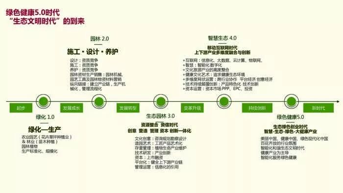 生态园林时代的发展先后经历了园林绿化1.0时期,解决了黄土不见天。这阶段主要是绿化苗木生产,从大到全国国土小到城镇都要植树造林,绿化祖国。随着经济的发展,光有绿化是不行的,还要美化、香化、彩化、净化、艺术化,这样进入了园林2.0时期,企业形成设计、施工、养护以及园林资材生产销售的纵向链接。随着城镇化的加速,水环境污染、大气雾霾严重、山体破坏加剧,就到了生态园林3.0时期,生态修复、城市修补、海绵城市建设等成为新的手段,企业也进入资源整合的诚信时代,创意、营造、管理、资本、创新一体化。互联网的发展,彻底改变了我们的生活,我们正经历IT时代向DT数字时代的转变,大数据、云计算、人工智能、AR、VR等技术在智慧城市、智慧治理的应用,直接推动了智慧园林4.0时代的变革,IOT物联网如火如荼发展,促进了上下游产业多维度融合与创新。上市融资、产业创新、智慧化转型是该阶段园林企业发展的主要路径和方向。