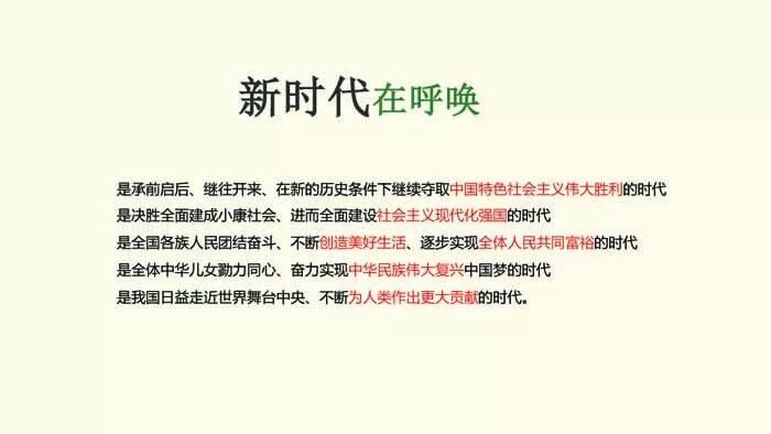首先你们正处在一个好时代,十九大的胜利召开,为国家未来发展指明了方向,也为同学们提供了更好的发展空间。我们要在2020年实现全面小康的现代化成果,我们要实现美丽美好的生活,这是我们全体人民奋斗的动力,也就是说我们要实现2个百年奋斗目标,第一个一百年,中国共产党成立100周年(即2021年)要全面建成小康社会;第二个一百年,新中国成立100周年(即2049年)初步建成富强、民主、文明、和谐的社会主义现代化国家。在这个新时代,我们有两个初心,一是为中国人民谋幸福,二是为中华民族谋复兴。作为大学生,要有伟大的理想,敢于面对未知的世界,更要懂得如何把握自己,挑战未来!